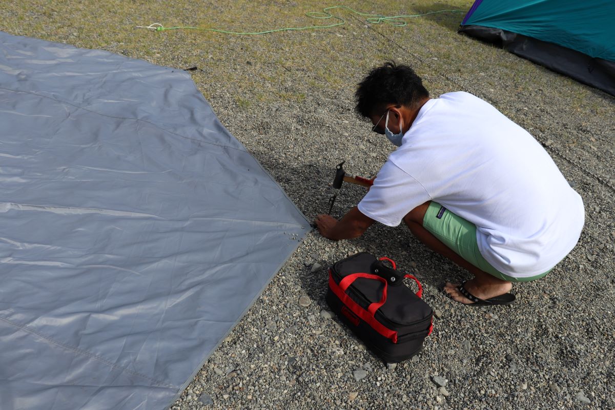 テントをはるために無数のペグをカンカンうつ。