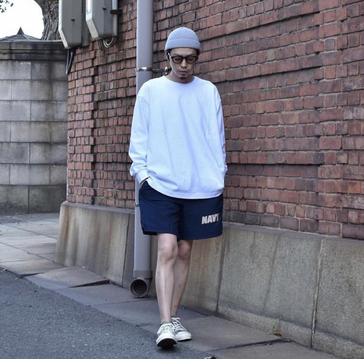 膝上丈の短パンと相性の合うトップスは、ジャストから大き目。